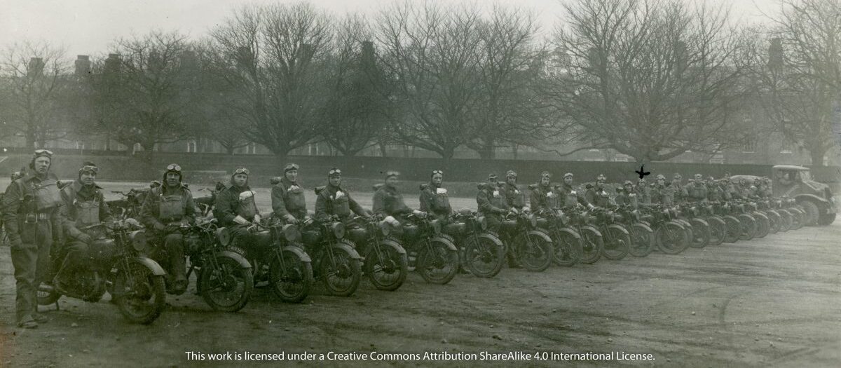 The banner photograph at the top of this page is of a motorcycle detachment of Number 2 Company of the Canadian Provo Corps in Southern England, circa 1941. The arrow drawn on the photo (fifteenth from left) designates Harry William Manchester.
