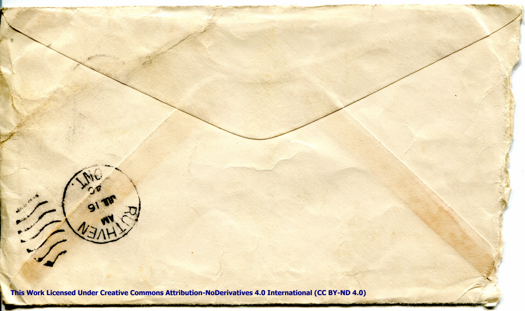 Personal Letter to Mrs. Elton Newman – May 13, 1940, sent from Windsor, Ontario, Canada, envelope, reverse.
