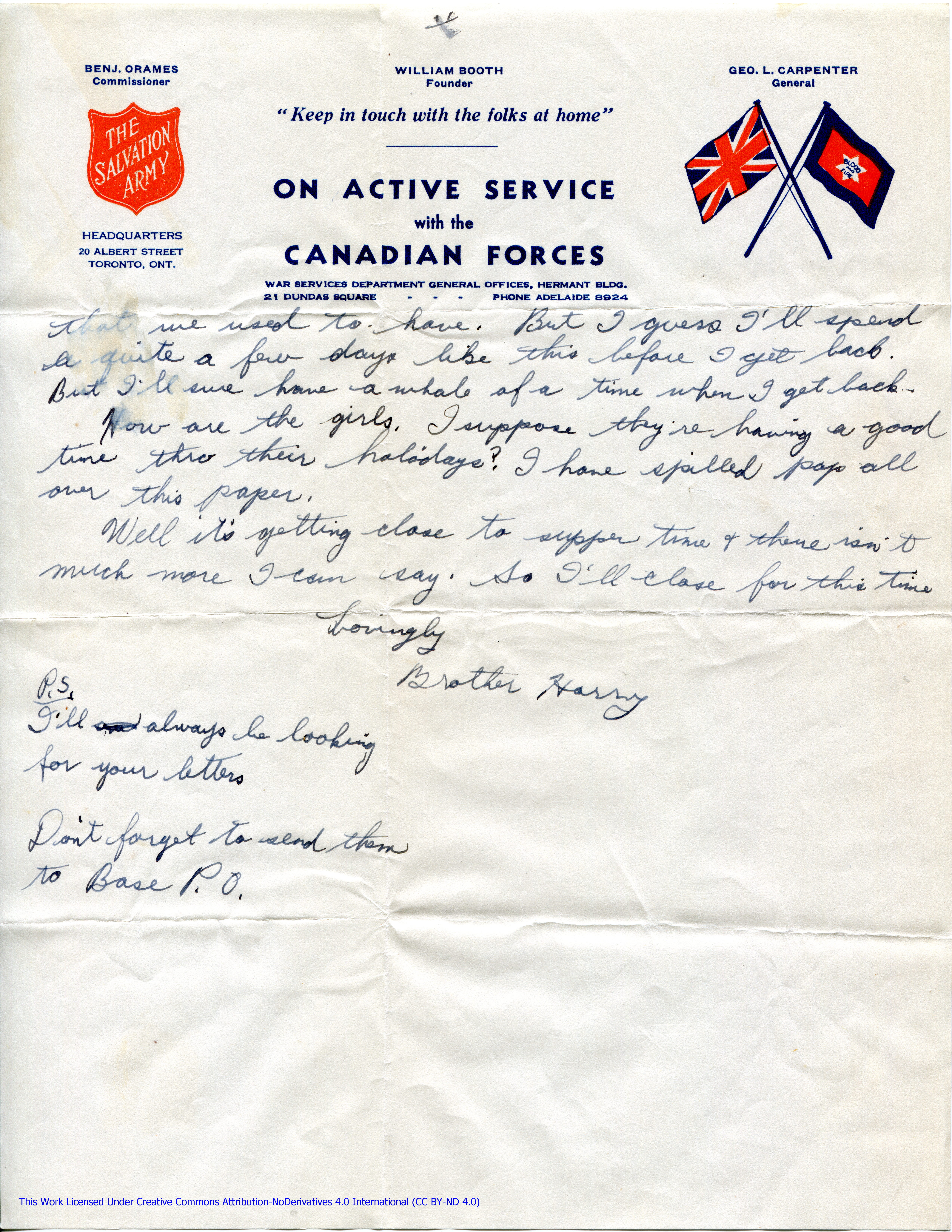 You can send my mail to “Base P.O.” instead of Camp Borden from now on. Until I tell you different. I got two letters from Peggy. & on from Garnet & his folds. Peggy’s was written Sat. nite before I made the phone call. & the other Sun. nite. I haven’t got any that’s been written since Mon. yet.