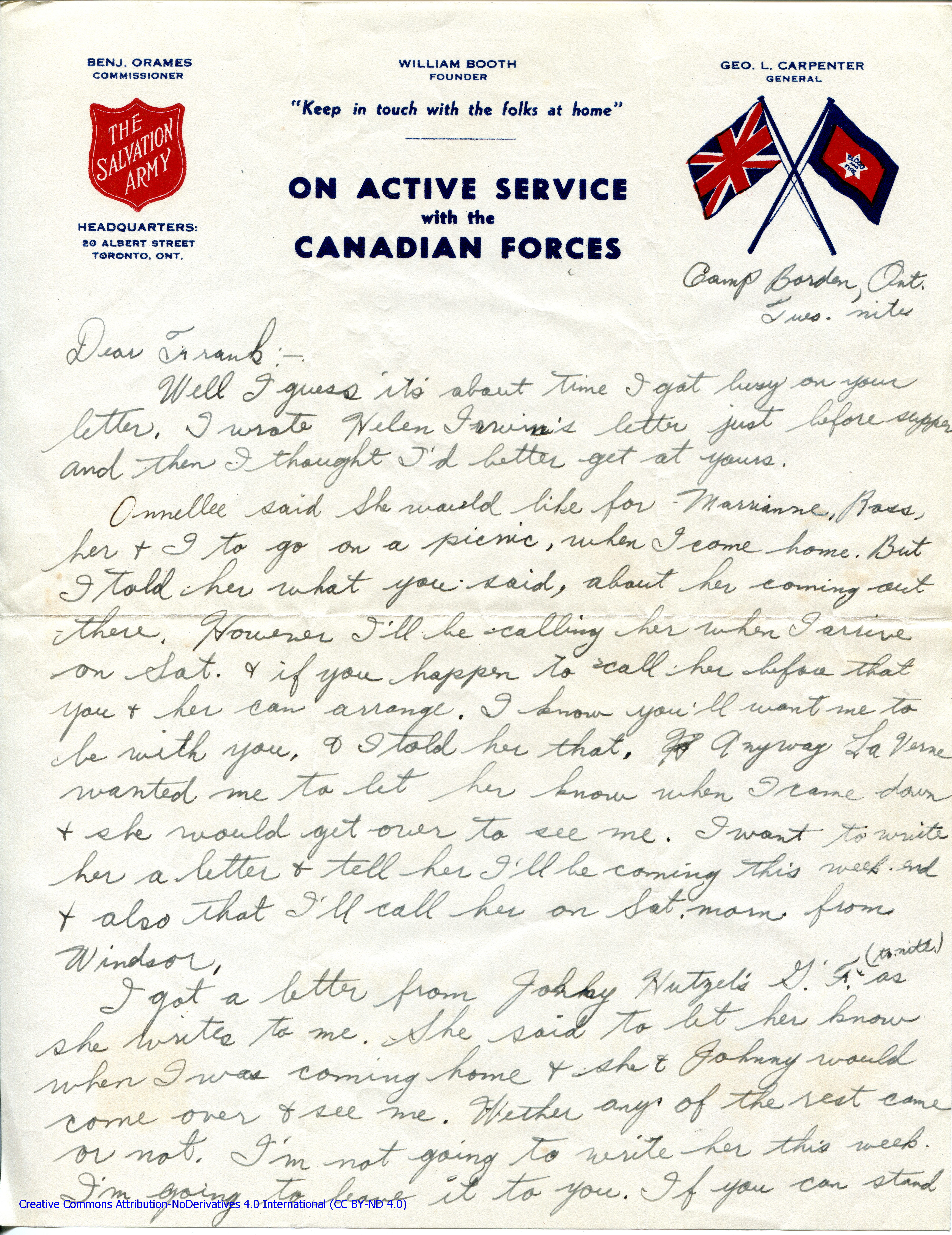 Personal Letter to La Verne Woods – June 4, 1940, sent from Camp Borden, Ontario, Canada, Page 1.