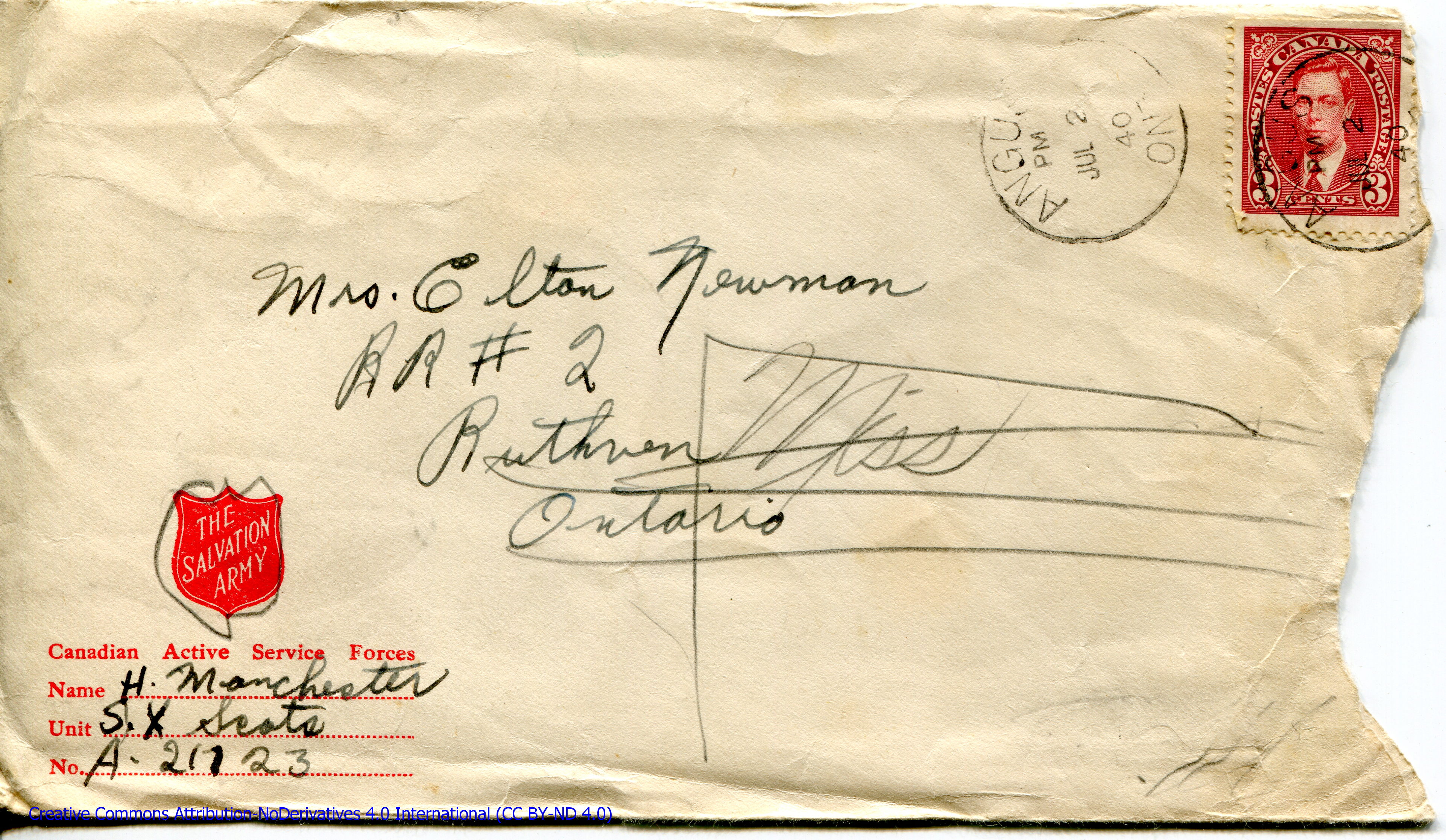 Personal Letter to Mrs. Elton Newman – June 6, 1940, sent from Camp Borden, Ontario, Canada, Envelope, Obverse.
