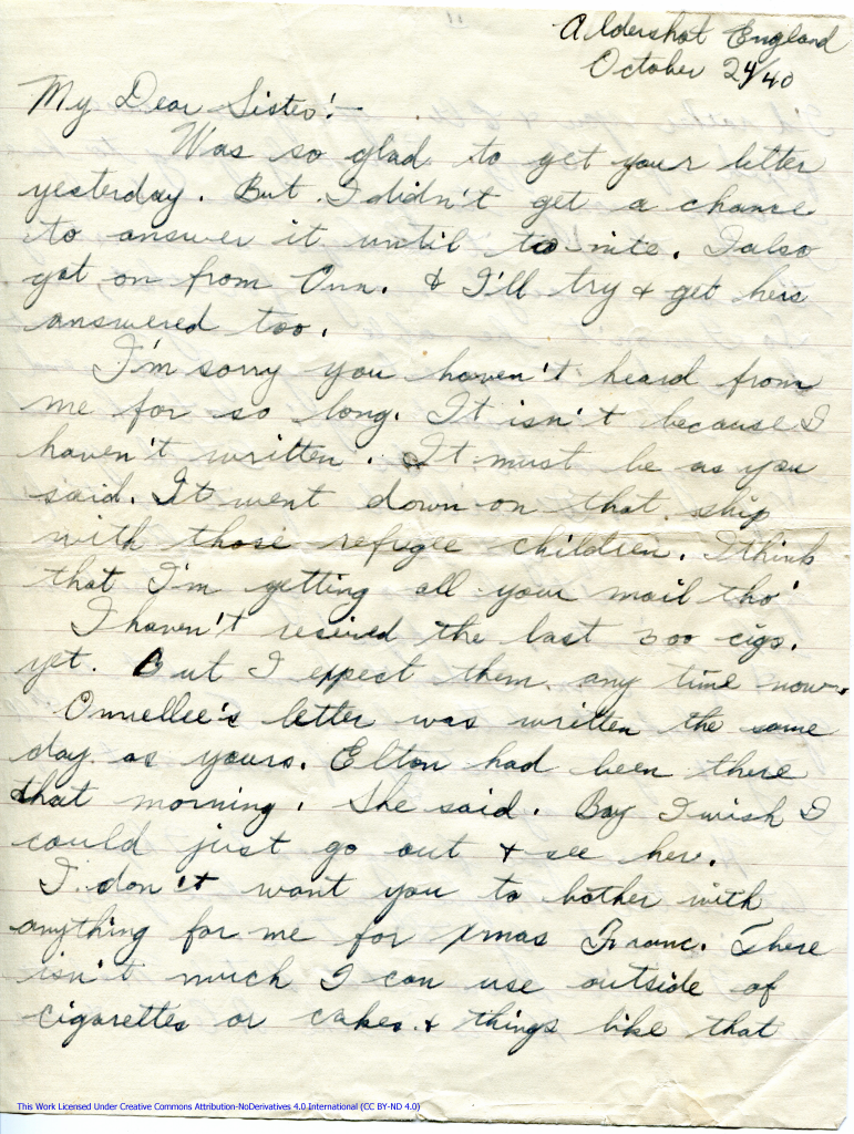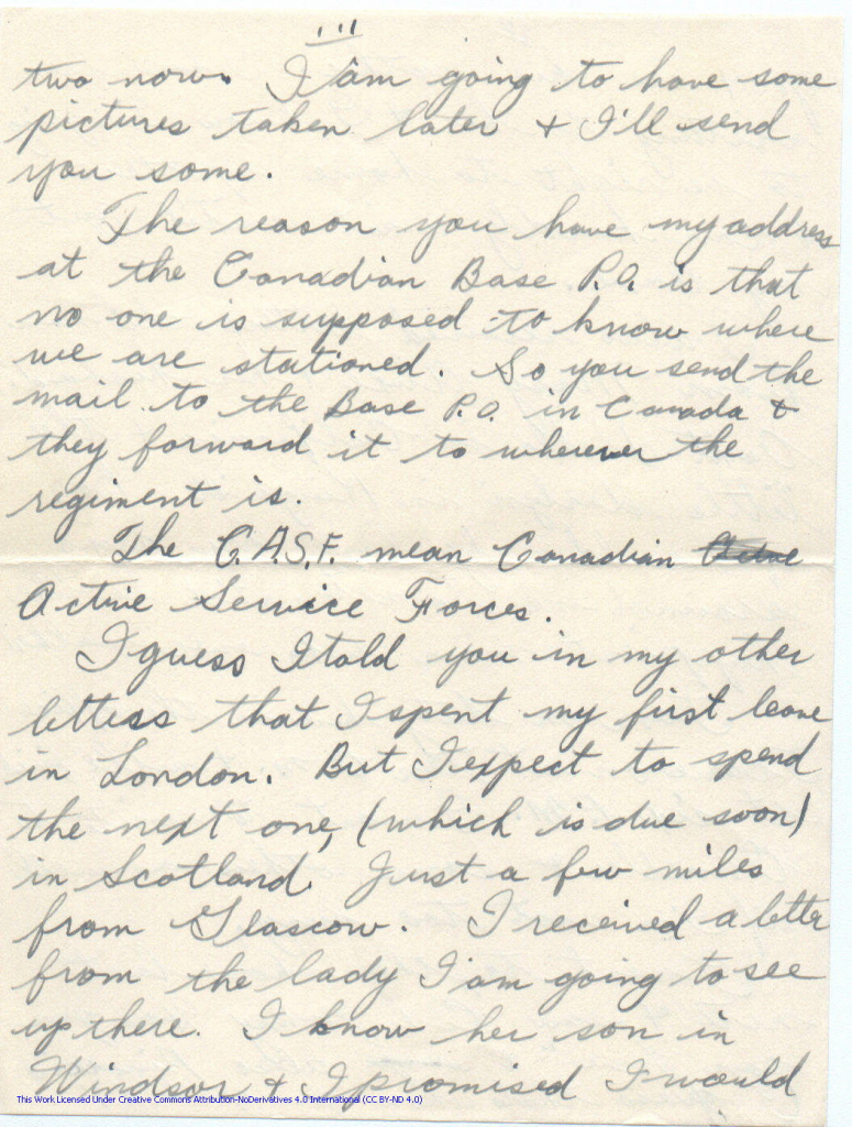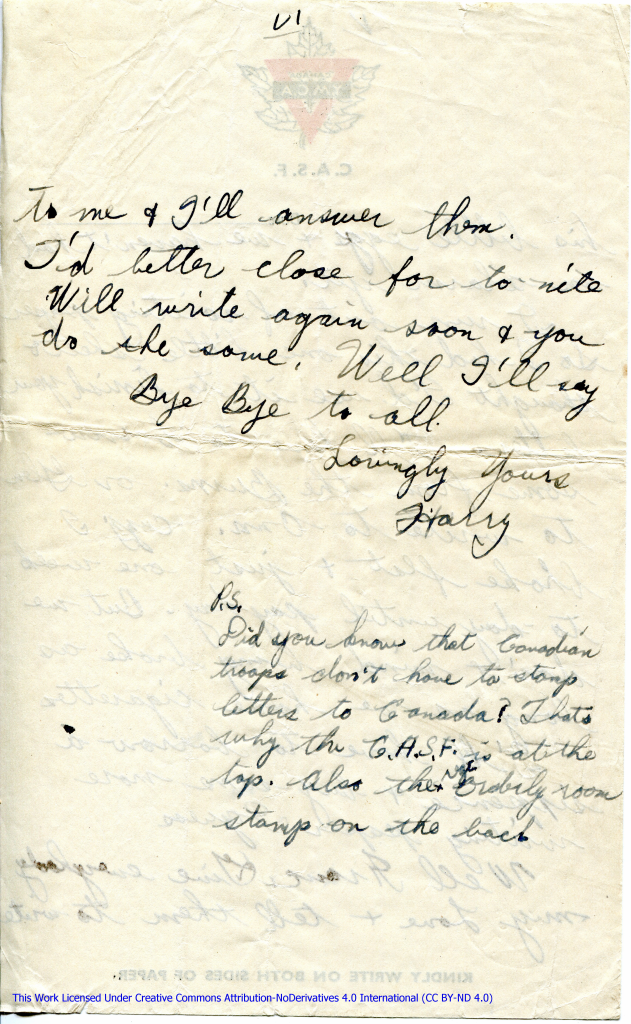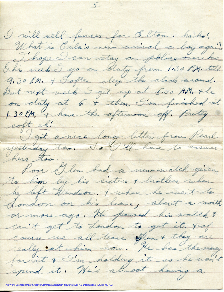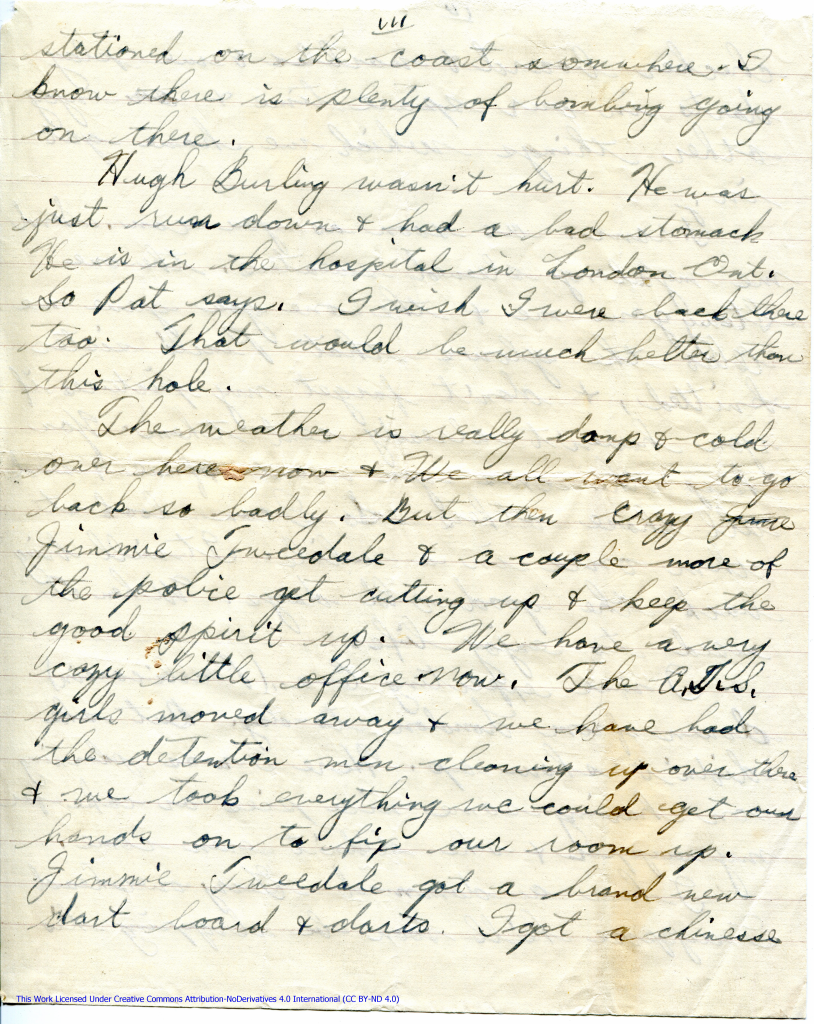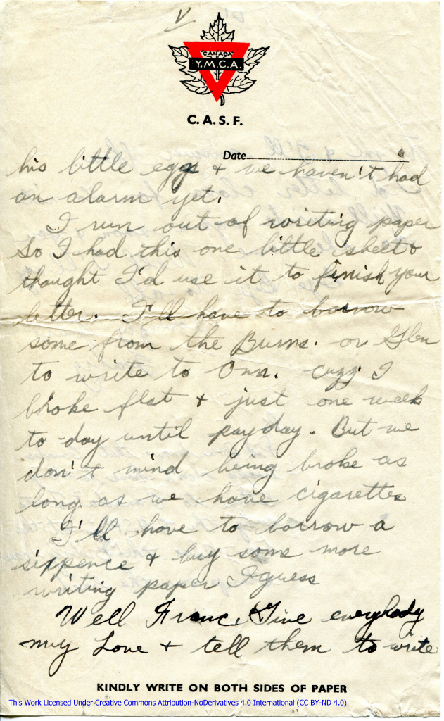 We have had a grand day to-day. The sun shone all day long. I washed my pants to my oldest Battle dress uniform, yesterday & so I hung it out in the sun to-day & it dried real good. I’ll have to find time to press them to-morrow. It will likely rain to heat the old devil to-morrow cuz’ this is the first day we’ve had without rain for I don’t know how long