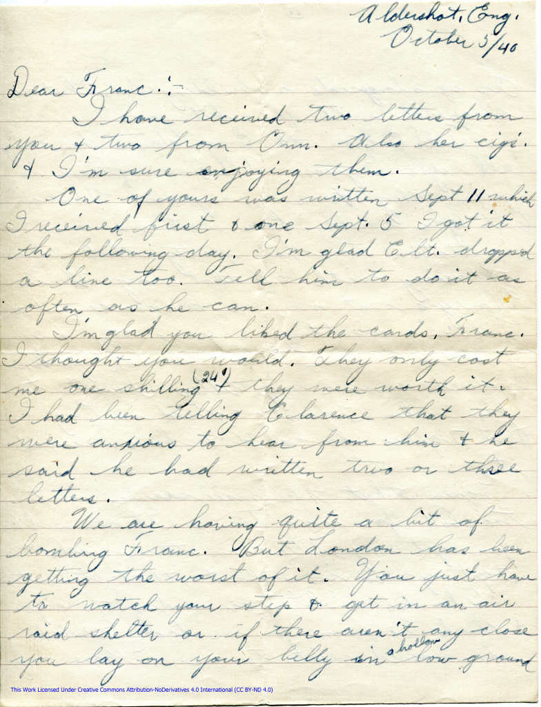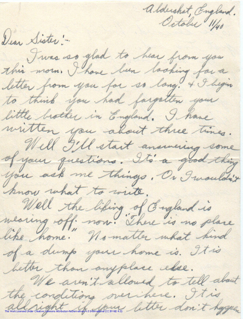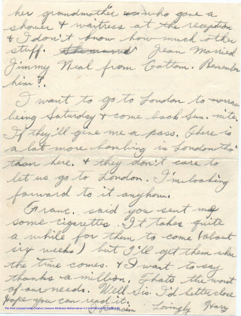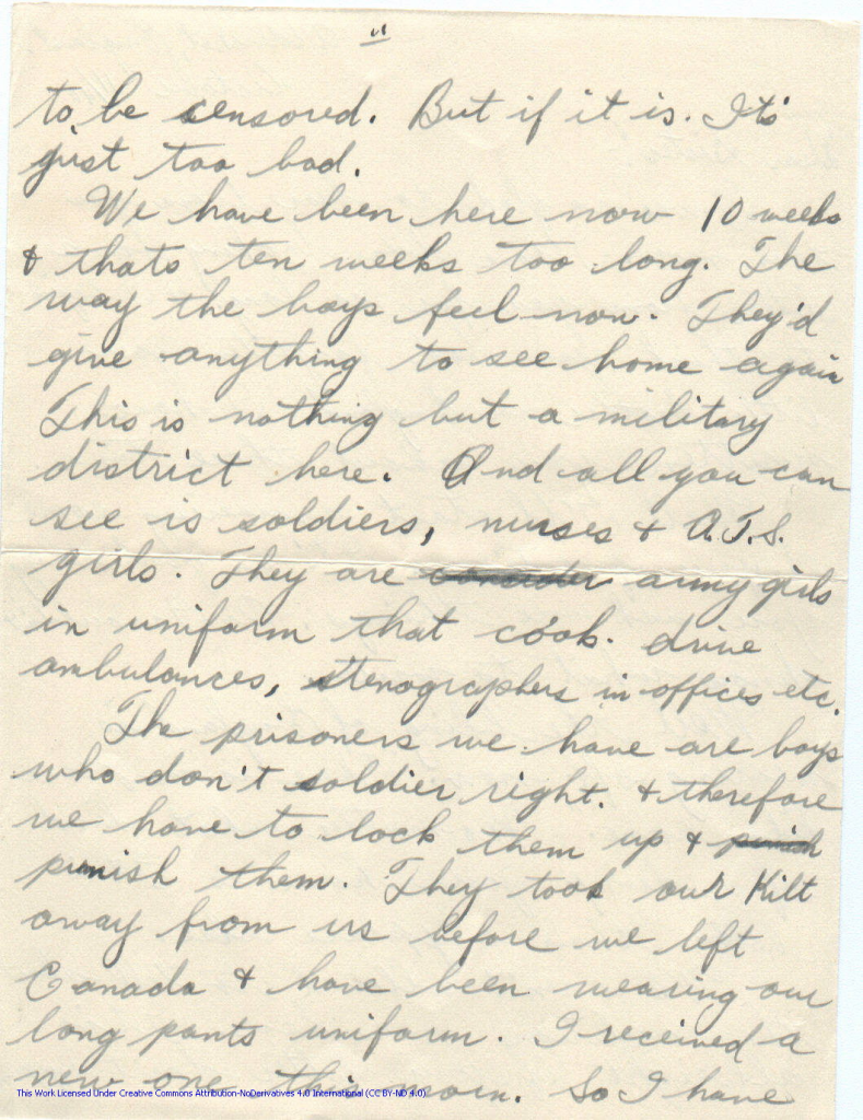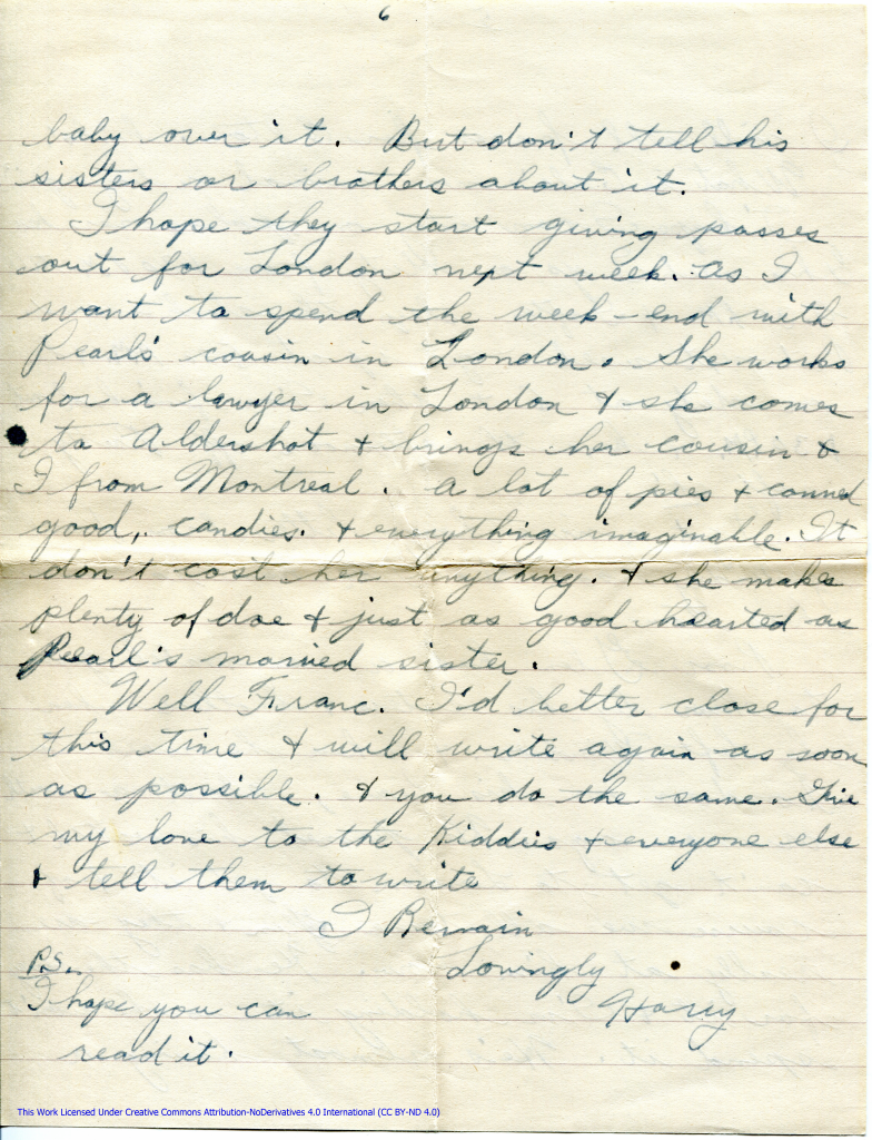 We have had a grand day to-day. The sun shone all day long. I washed my pants to my oldest Battle dress uniform, yesterday & so I hung it out in the sun to-day & it dried real good. I’ll have to find time to press them to-morrow. It will likely rain to heat the old devil to-morrow cuz’ this is the first day we’ve had without rain for I don’t know how long