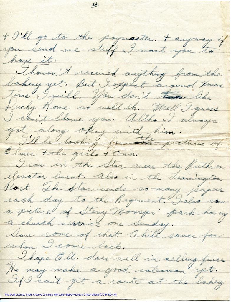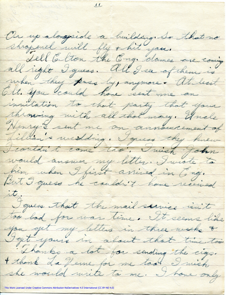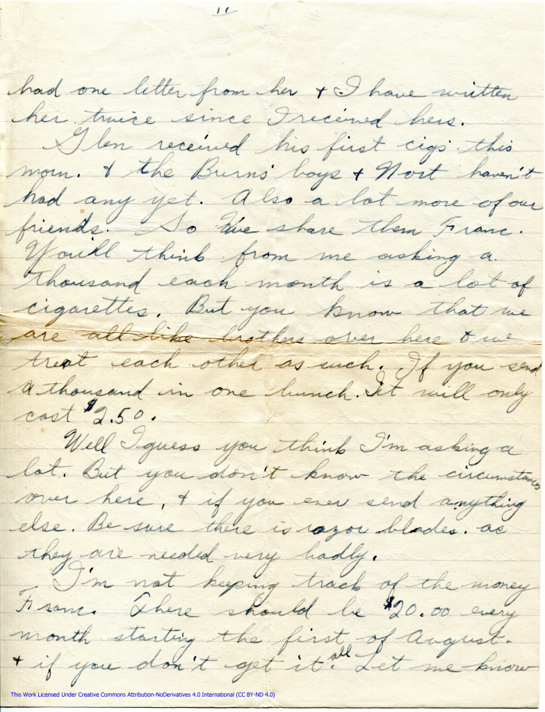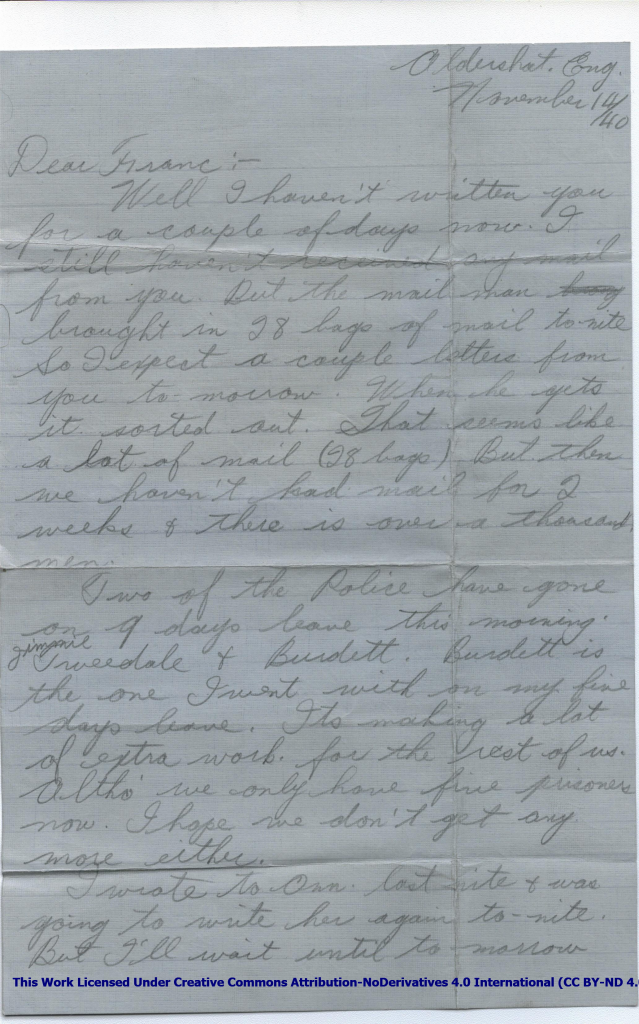 Well I haven’t written you for a couple of days now. I still haven’t received any mail from you. But the mail man brought in 28 bags of mail to-nite So I expect a couple letters from you to-morrow. When he gets it sorted out. That seems like a lot of mail (28 bags) But then we haven’t had mail for 2 weeks & there is over a thousand men.