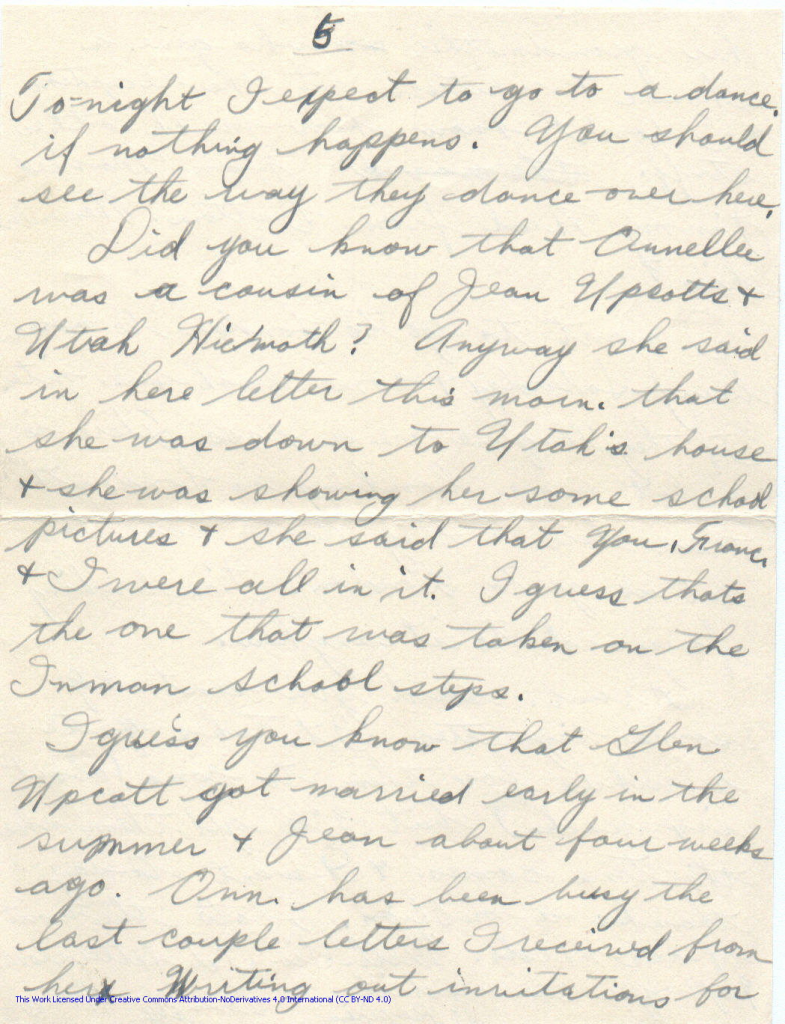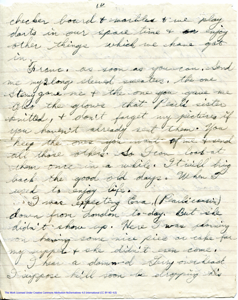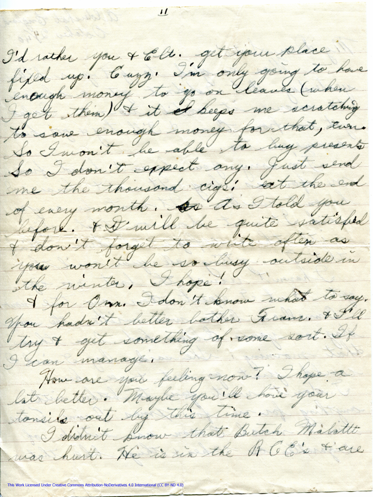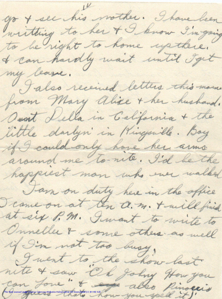 I wrote to Onn. last nite & was going to write her again to-nite. But I’ll wait until to-morrow & I’ll get a letter from her (I hope) & then I can answer it. I’ll answer yours too. If I don’t have to work too late.