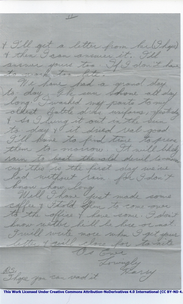 Well I have just made some coffee & I told Glen to come over to the office & have some. I don’t know wether he’ll be here or not. I will write more when I get your letter & will close for to-nite