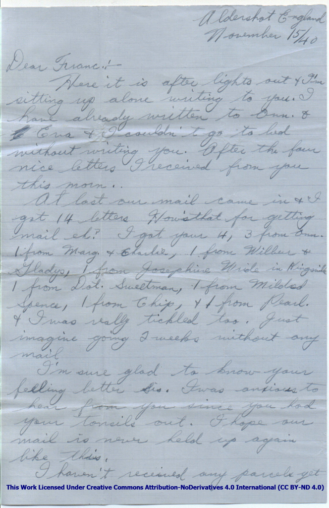 At last our mail came in & I got 14 letters How’s that for getting mail eh? I got your 4, 3 from Onn. 1 from Marg. and Charlie,1 from Wilbur and Gladys, 1 from Josephine Wride in Kingsville 1 from Dot Sweetman, 1 from Mildred Spence, 1 from Chip, & 1 from Pearl. & I was really tickled too. Just imagine going 2 weeks without any mail