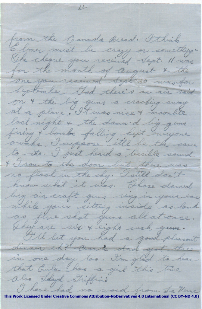 I haven’t received any parcels yet from the Canada Bread. I think Elmer must be crazy or something. The cheque you received Sept. 11 was for the month of August & the one you received Sept 30 was for September. God there’s an air raid on & the big guns are cracking away at a plane. It was nice & moonlite last night & the damn d big guns firing & bombs falling kept everyone awake. I suppose it’ll be the same to-nite. I just heard a terrible sound & I ran to the door but there was no flash in the sky. I still don’t know what it was. Those damned big aircraft guns ring in your ear while your sitting inside as loud as five shotguns all at once. They are 6 & 8 inch guns.