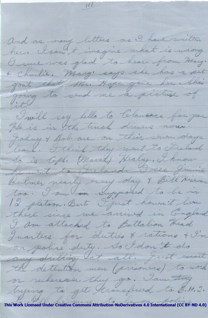 I will say hello to Clarence for you he is in the truck drivers now. Johny & Bob are on their seven days leave. I think they went to Ireland So is Cpl. (Marsh) Healy. I know he went to Ireland. I see Jimmie Bulmer nearly every day & Bill Hiseman too. I am in supposed to be in 12 platoon. But I just haven’t been there since we arrived in England I am attached to Battalion Head Quarters for the duties & rations & I’m on police duty. So I don’t do any drilling at all. Just escort the detention men (prisoners) to work or wherever they go. I am trry trying to get transferred to B.H. 2. So I’ll be sure to be on police all the time. This is really a good job. There goes them guns again They really go to your ear drums if anything does.