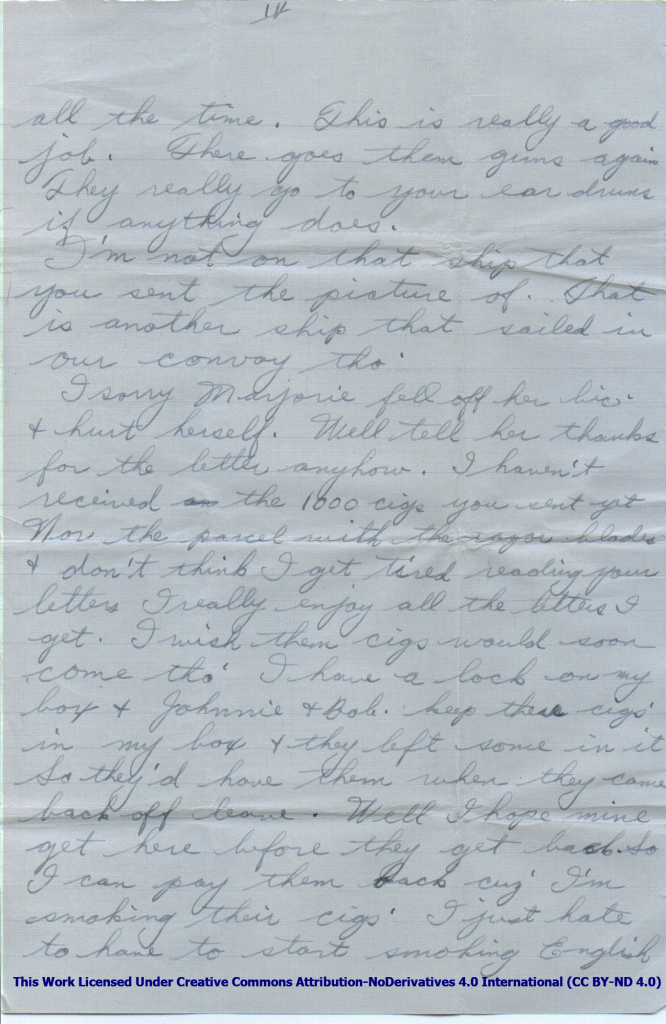I sorry Marjorie fell off her bic. & hurt herself. Well tell her thanks for the letter anyhow. I haven’t received an the 1000 cigs you sent Nor the parcel with the razor blades & don’t think I get tired of reading your letters I really enjoy all the letters I get. I wish them cigs would soon come tho’ I have a lock on my box in Johnnie & Bob keep these cigs in my box & they left some in it So they have them when they came back off leave. Well I hope mine get here before they get back So I can pay them back cuz’ I’m smoking their cigs. I just hate to have to start smoking English Cigarettes.