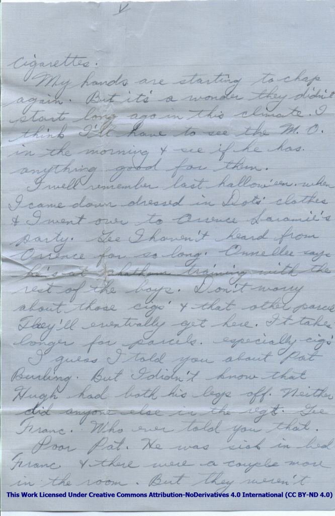 I well remember last halloween when I came down dressed in Dots’ clothes & I went over to Orrence Laramie’s party. Gee I haven’t heard from Orrence for so long. Onnellee says he said Chatham training with the rest of the boys. Don’t worry about those cigs & that other parcel They’ll eventually get here. It takes longer for parcels. especially cigs