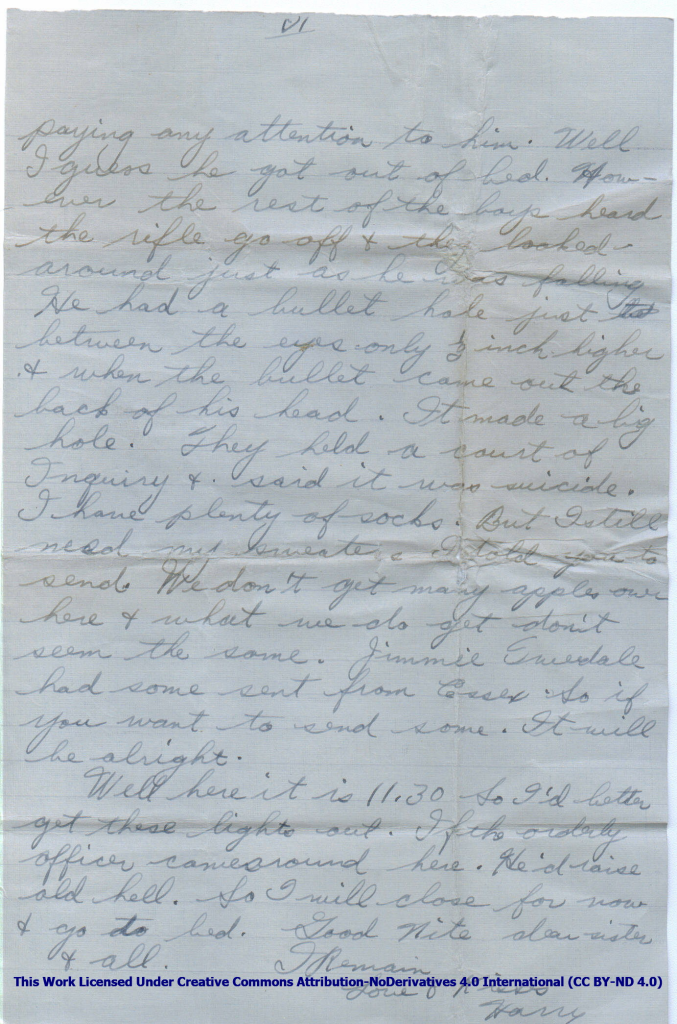 Well here it is 11.30 So I’d better get these lights out. If the orderly officer comes around here. He’d raise old hell. So I will close for now & go to bed. Good nite dear sister & all.