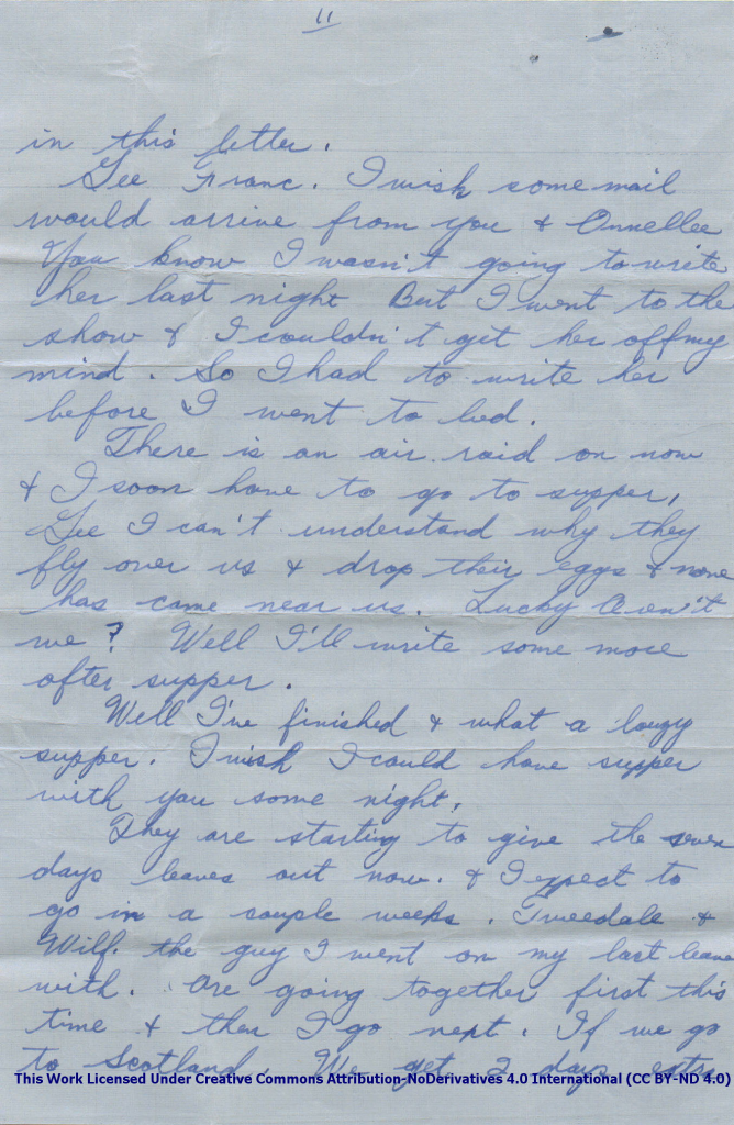 There is an air raid on now & I soon have to go to supper. Gee I can’t understand why they fly over us & drop their eggs & none has come near us. Lucky Aren’t we? Well I’ll write some more after supper.