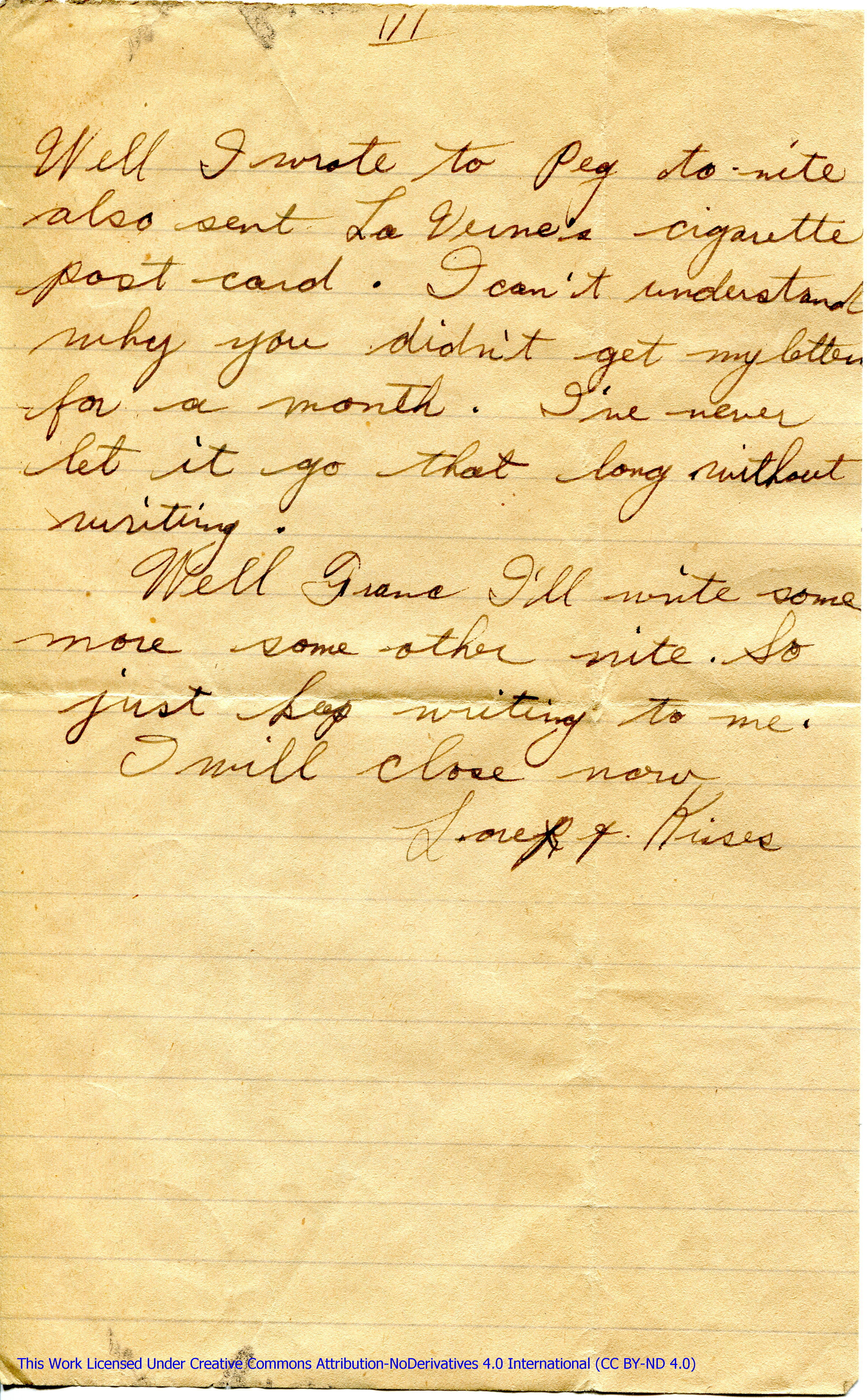 Well here it is 11.30 So I’d better get these lights out. If the orderly officer comes around here. He’d raise old hell. So I will close for now & go to bed. Good nite dear sister & all.