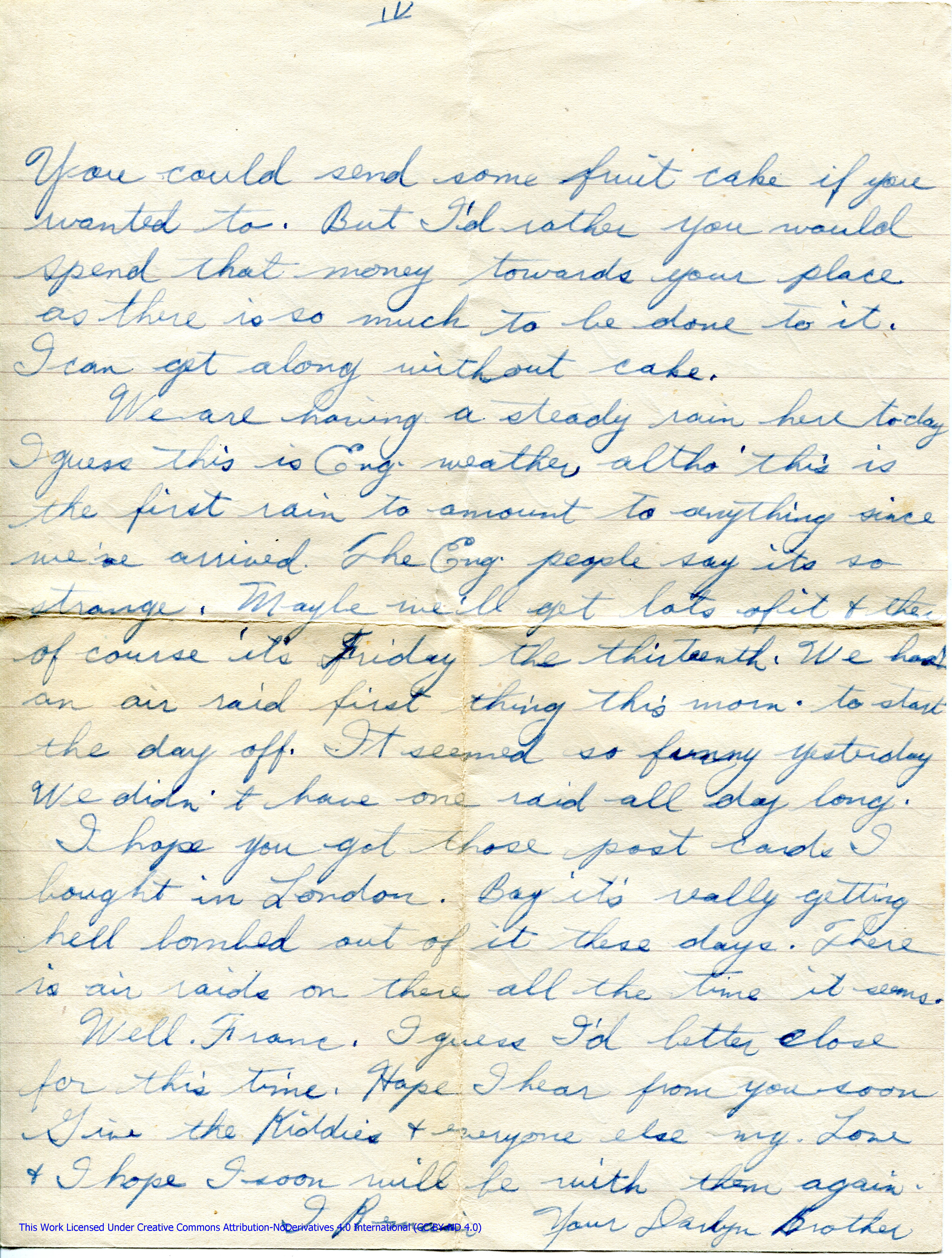 “We had an air raid first thing this morn. to start the day off. It seemed so funny yesterday We didn’t have on raid all day long.”