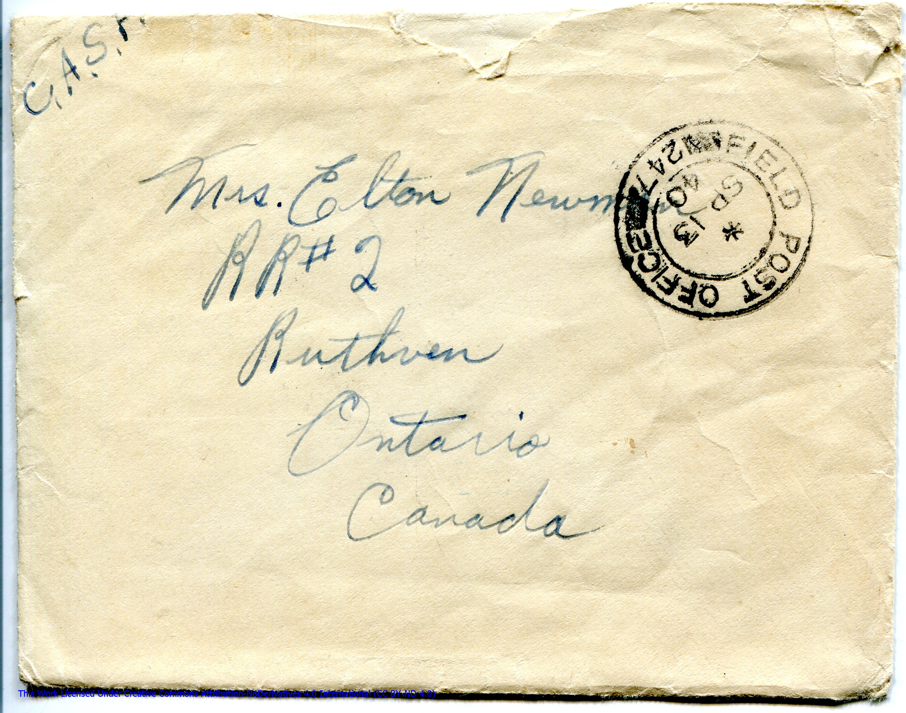 Personal Letter to Mrs. Elton Newman – September 13, 1940, sent from Aldershot, England, United Kingdom, Envelope, Obverse.