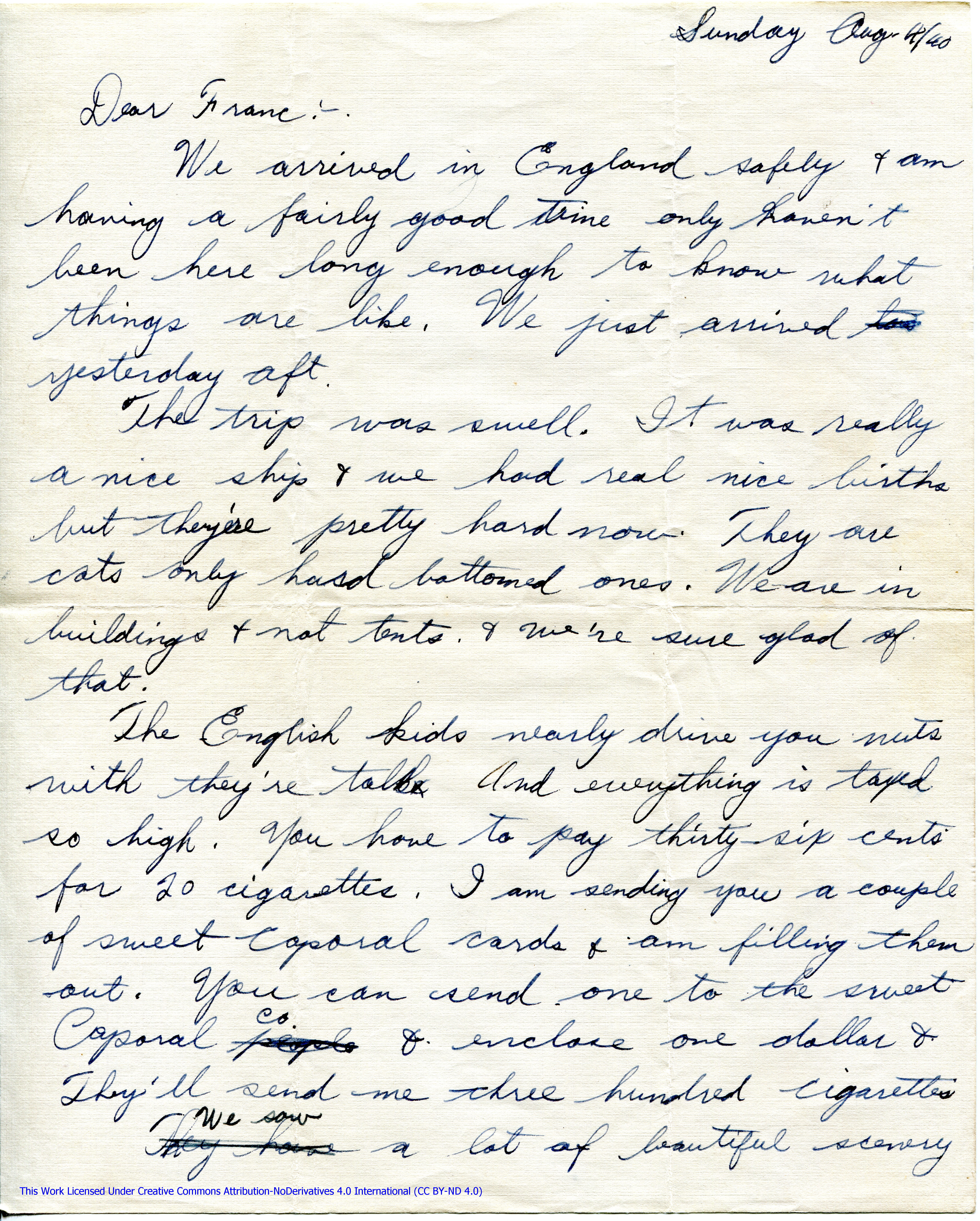 “It isn’t so bad over here if my relatives & friends were here & if tobacco’s & razor blades & other necessities wer’nt so high in price.”