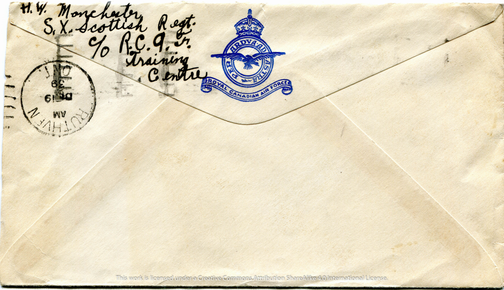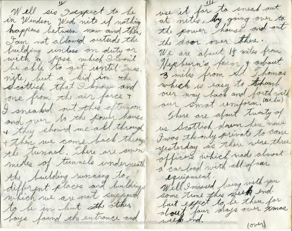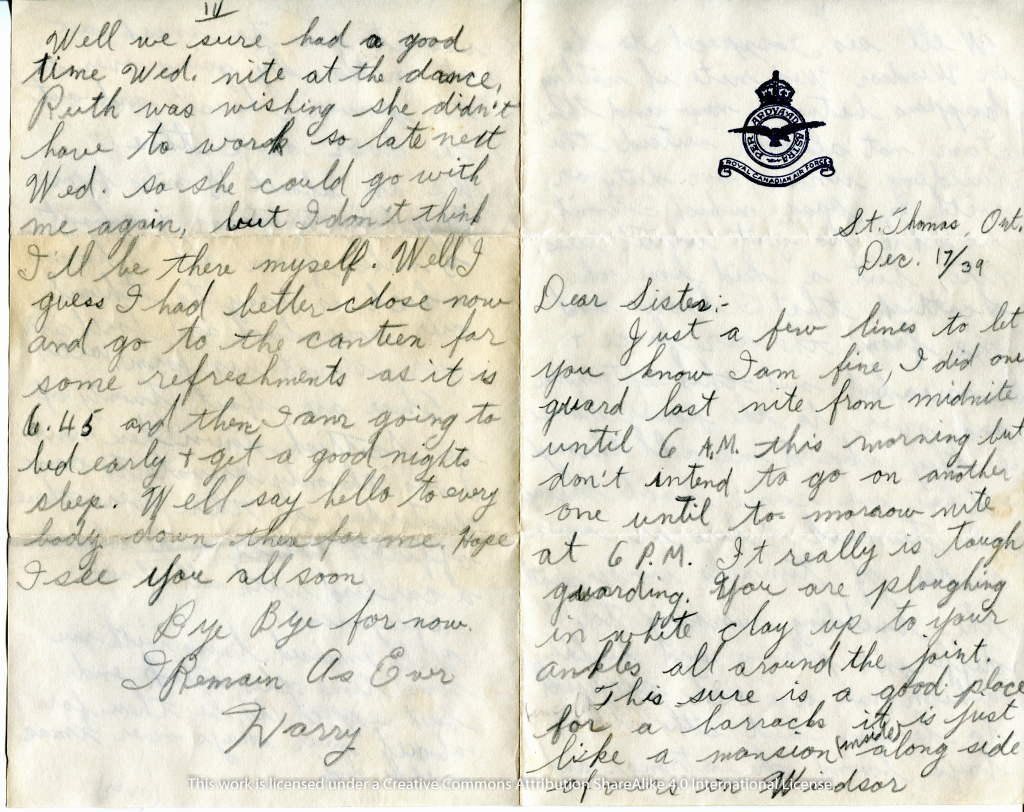 Just a few lines to let you know I am fine, I did one guard last night from midnight until 6:00 A.M. this morning but didn’t intend a go on another one until tomorrow night at 6:00 PM. It really is tough guarding. You are plowing in white clay up to your ankles all around the joint. This sure is a good place for a barracks it is just like a mansion (inside) alongside of ours in Windsor.