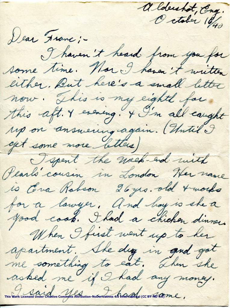 Artifact 1940-10-16-a – Letter to Mrs. Elton Newman, sent from Aldershot, England, United Kingdom – Page 2.