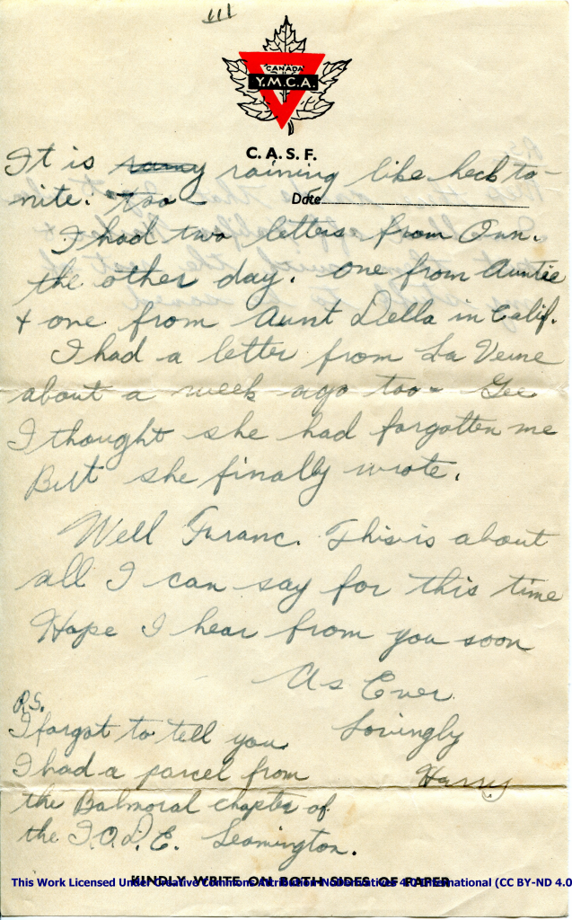 Artifact 1940-10-11-a – Letter to Miss La Verne Woods, sent from Aldershot, England, United Kingdom – Page 3.