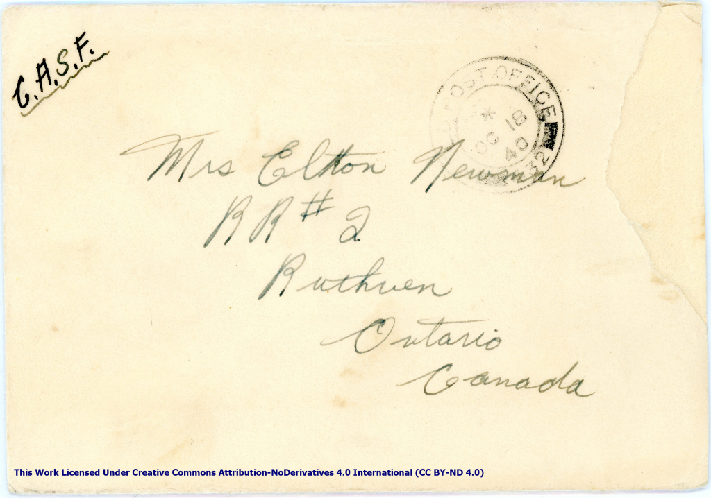 Artifact 1940-10-19-b – Letter to Mrs. Elton Newman, sent from Aldershot, England, United Kingdom – Envelope, Obverse.