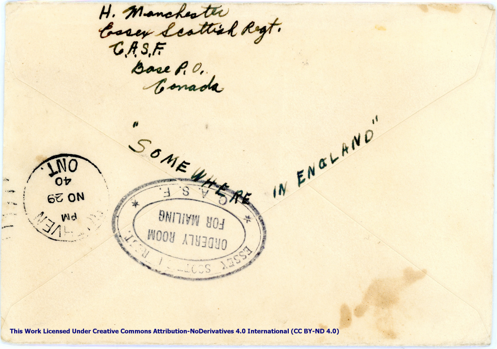 Artifact 1940-10-27-b – Postcard to Mrs. Elton Newman, sent from Aldershot, England, United Kingdom – Envelope, Reverse.