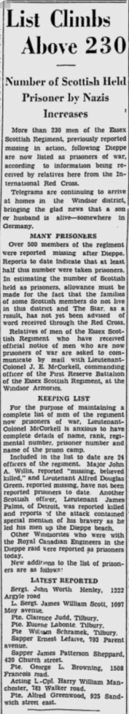 Included in the list to date are 24 officers of the regiment. Major John A. Willis, reported “missing, believed killed, and Lieutenant Alfred Douglas Green, reported missing, have not been reported prisoners to date. Another Scottish officer, Lieutenant James Palms, of Detroit, was reported killed and reports of the attack contained special mention of his bravery as he led his men up the Dieppe beach.
