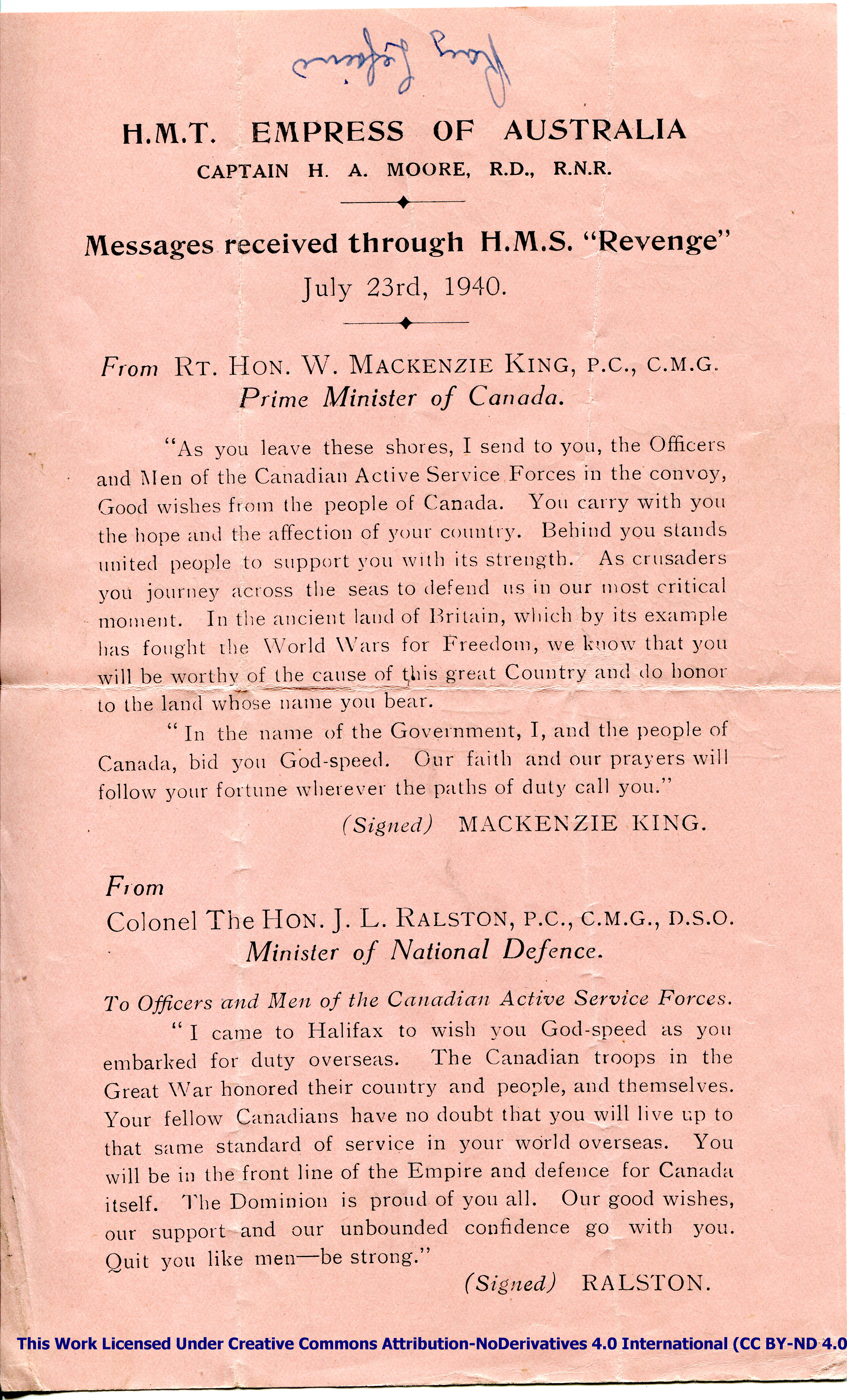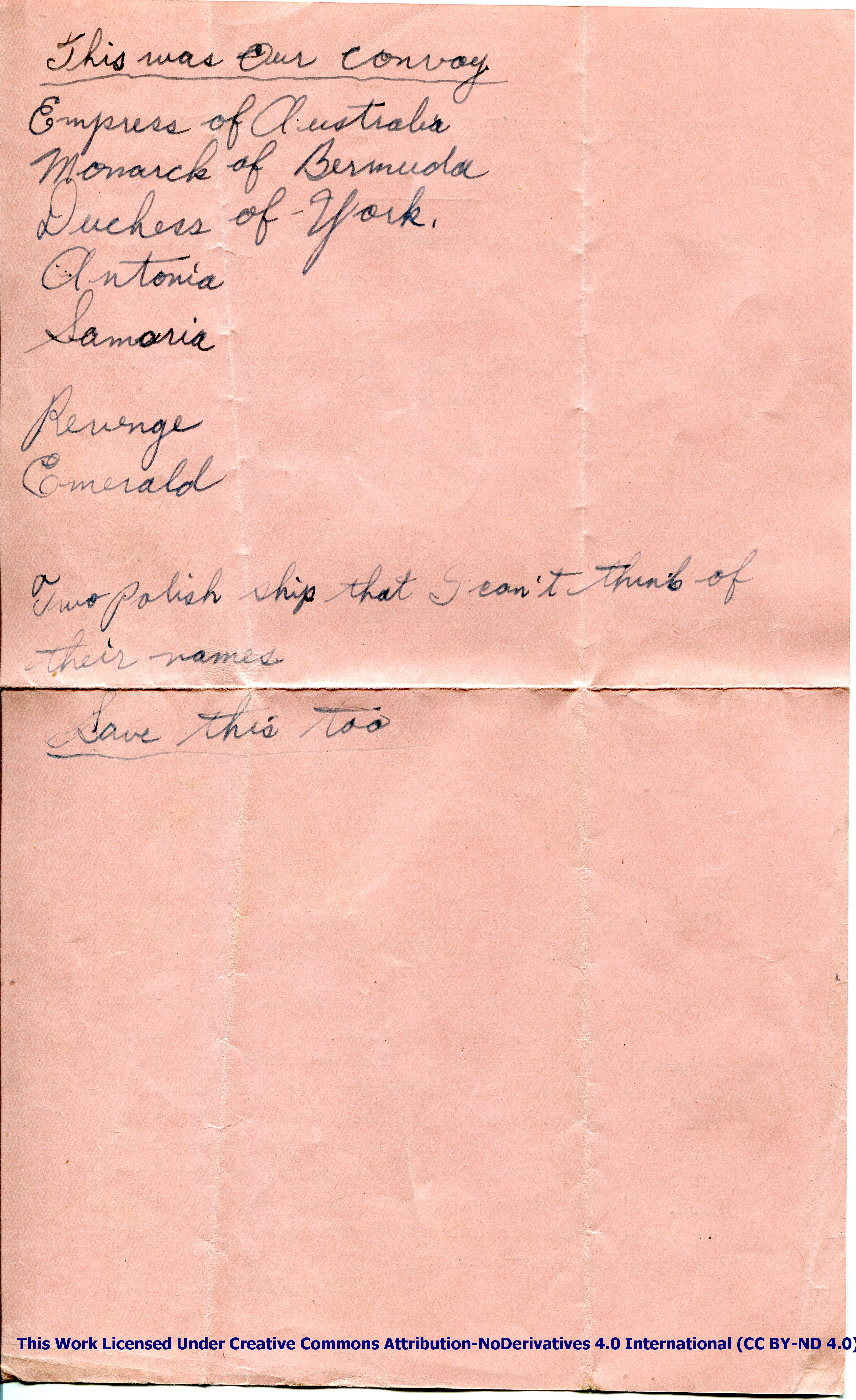The information cards shown above were distributed to Harry William Manchester and other passengers aboard H.M.T. (His Majesty’s Troopship) Empress of Australia during the Trans-Atlantic crossing from Halifax, Nova Scotia, Canada to Scotland, in convoy “TC6.”