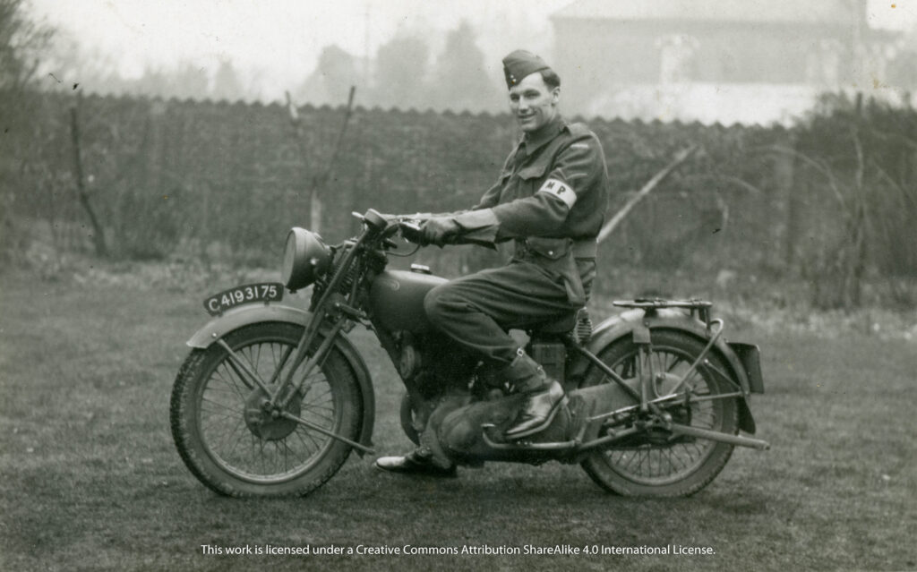 Harry performed military police duties in various southern England locales, including security patrols and motorized convoy escort duty. The photograph below is L/Cpl Harry William Manchester on his motorcycle, Spring 1941.