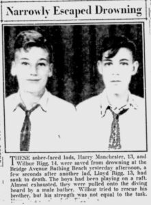 These sober-faced lads, Harry Manchester, 13, and Wilbur Rigg, 14, were saved from drowning at the Bridge Avenue Bathing Beach yesterday afternoon, a few seconds after another lad, Lloyd Rigg, 13, had sank to death. The boys had been playing on a raft. Almost exhausted, they were pulled onto the diving board by a male bather. Wilbur tried to rescue his brother, but his strength was not equal to the task.