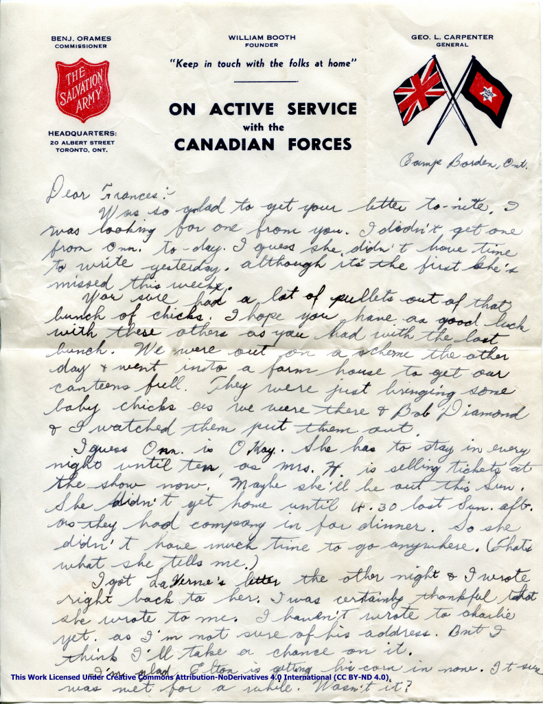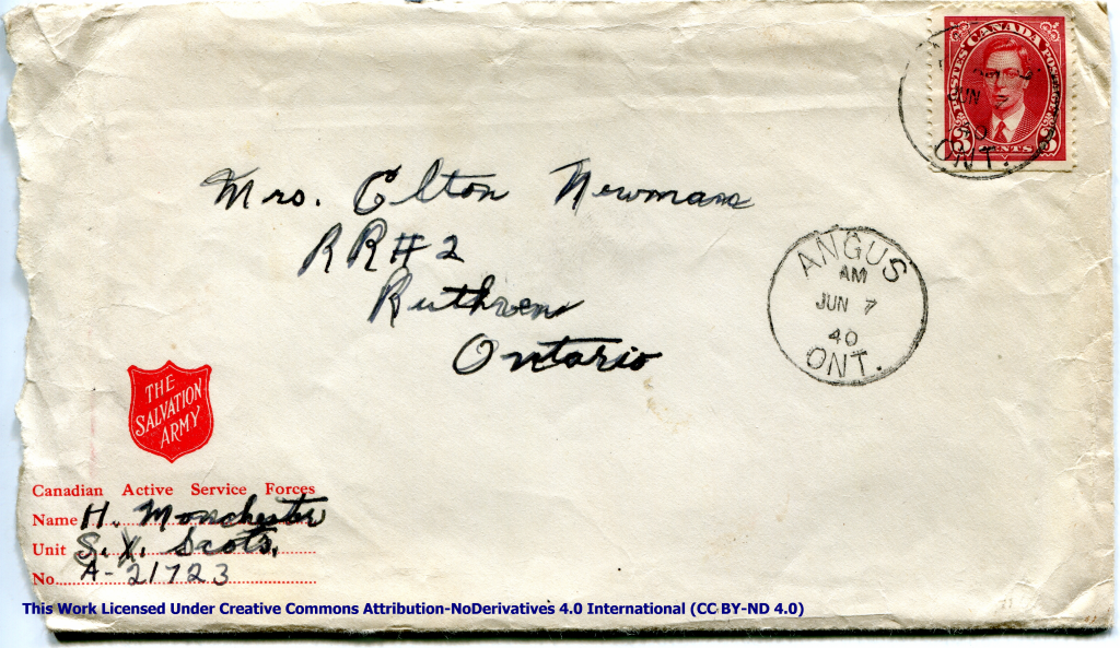 Artifact 1940-06-06-a – Letter to Mrs. Elton Newman sent from Aldershot, England, United Kingdom – Page 1.