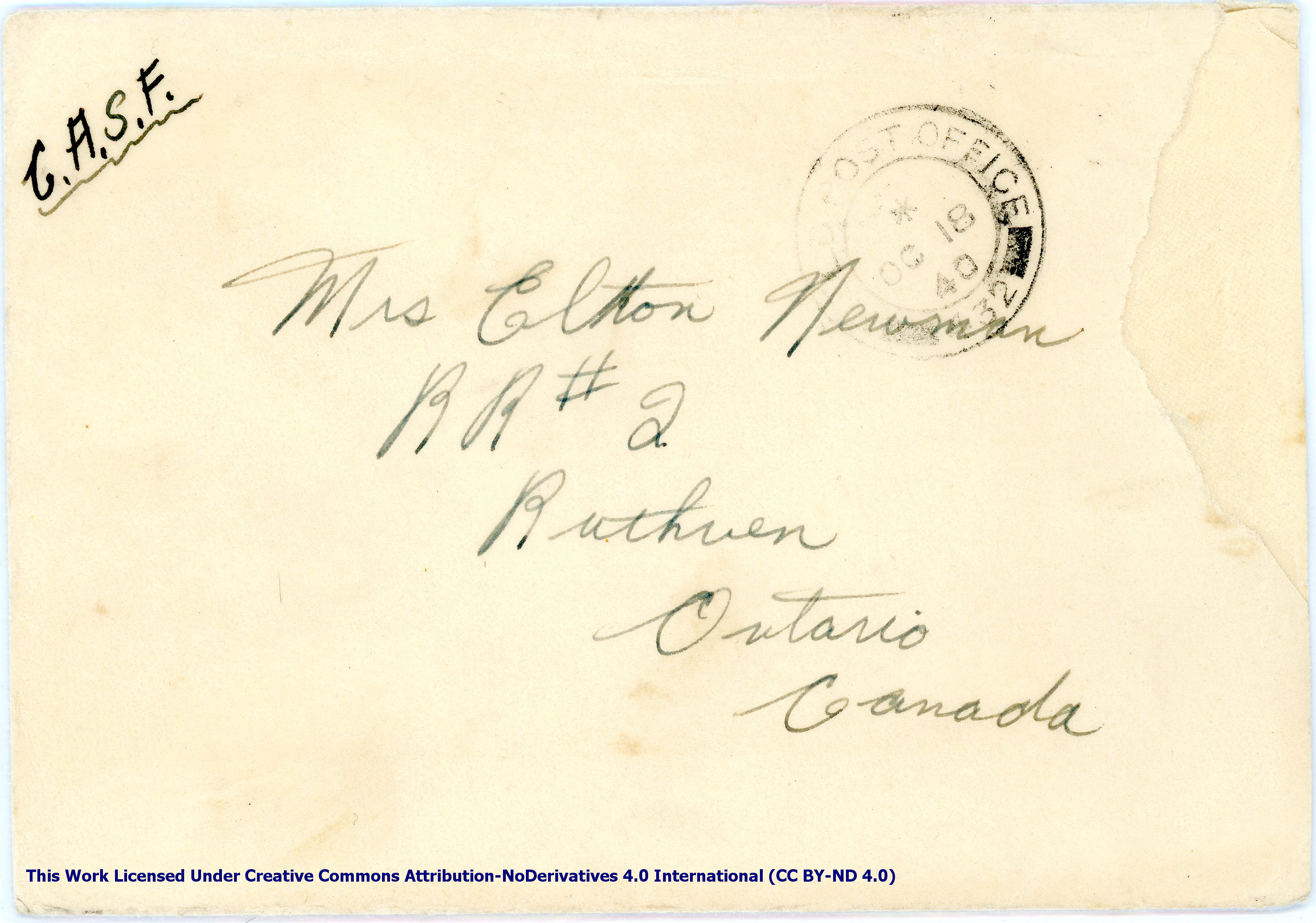 Personal Letter to Mrs. Elton Newman – October 16, 1940, sent from Aldershot, England, United Kingdom, Envelope, Obverse.