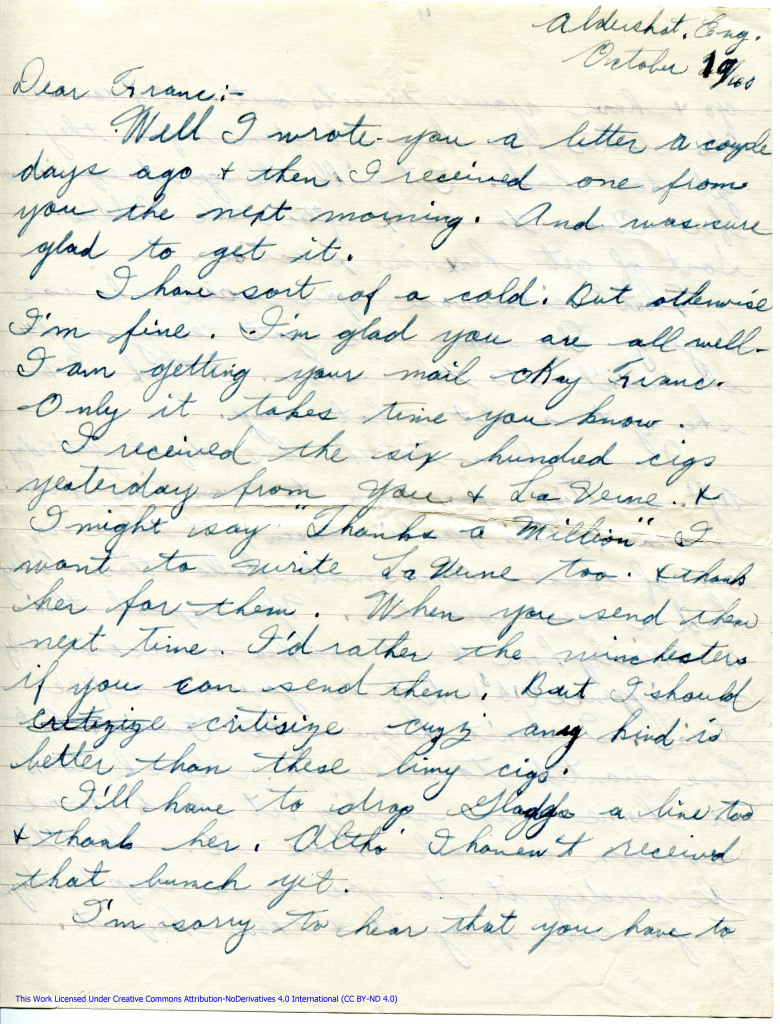 I received the six hundred cigs yesterday from you & La Verne. & I might say “Thanks a Million” I want to write La Verne too. & thank her for them. When you send them next time. I’d rather the winchesters if you can send them. But I should critizize critisize cuzz any kind is better than these limy cigs.